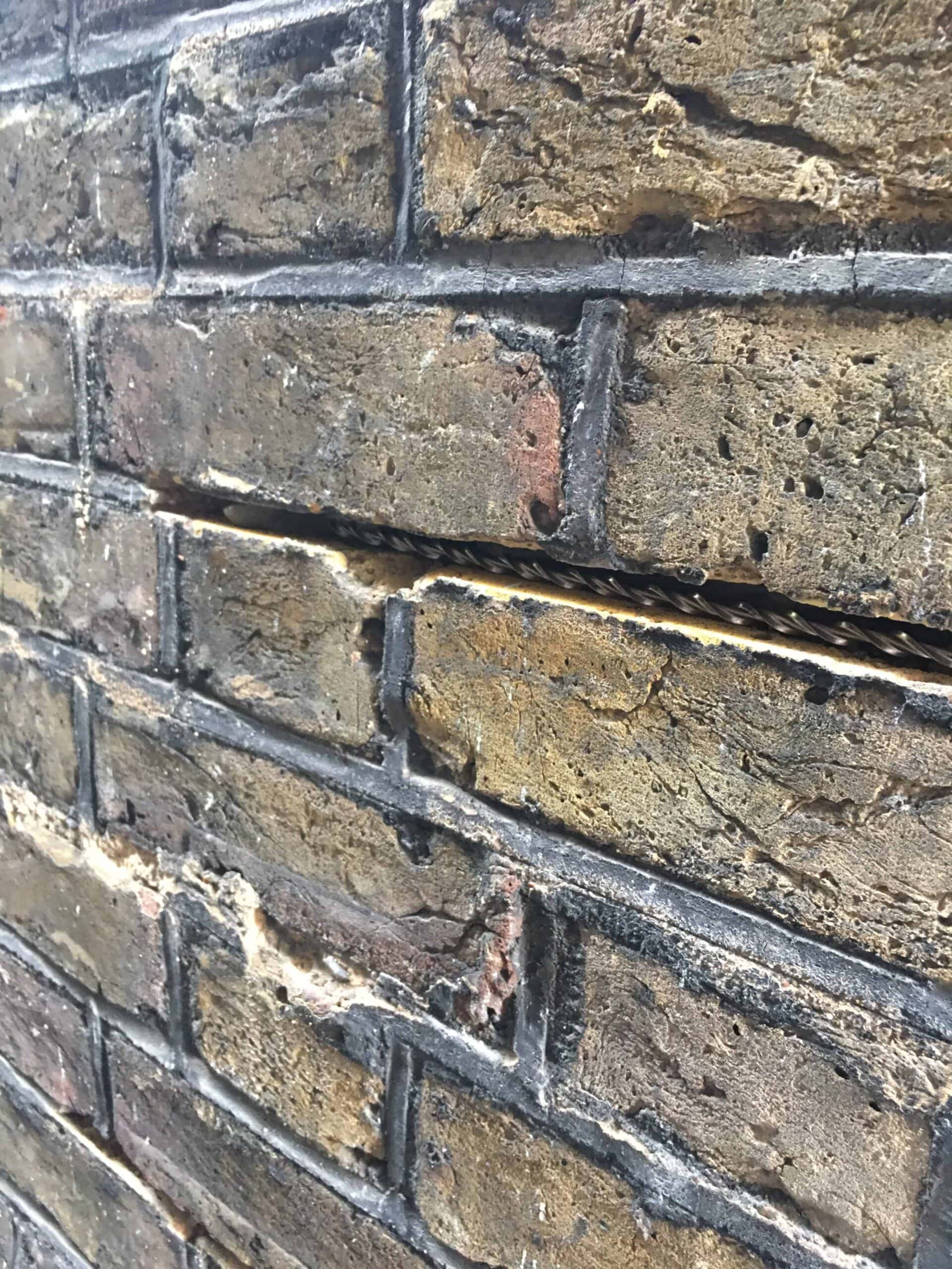 LSR started out by dealing with the side flank wall with the cracks in it. We cut out and replaced the cracked bricks and installed crack stitch bars to strengthen the wall.
